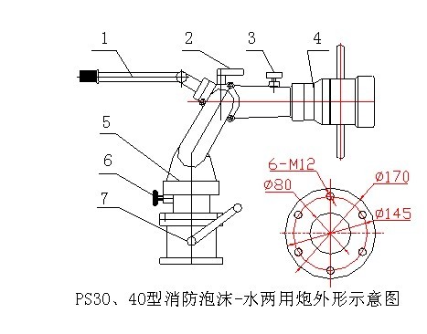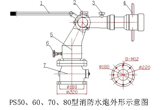 本產品主要結構外形如圖所示,由手柄(1)、鎖緊手柄(2)、壓力表(3)、炮頭(4)、炮體(5)、水平鎖緊手柄(6)、球閥(7)等零部件組成。松開水平鎖緊手柄(6),控制手柄(1)可實現水平方向旋轉,并由水平鎖緊手并在任一位置鎖緊;同時松開上下鎖緊(2)轉動手柄(1)可實現仰俯轉動-35°~+70°;水炮的開花直流炮頭,可實現炮口水柱射流和開花散射(水霧)。