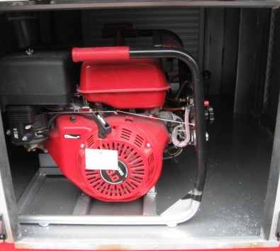 3. 該車主要功能和配置:一支可更換噴頭和高壓水槍、一臺進口的汽油機消防泵、可裝載800kg水的水罐、配有口徑65mm卡扣式消防栓接口可從市政消火栓取水、車上可坐2名義務消防員、還配有2具3kg干粉滅火器和2套個人防護裝備,水帶、水槍、消火栓扳手、鐵鍬、鐵錘、板斧、絕緣鉗、手電筒、擴音器、防毒面具等消防器材。車頂裝有LED爆閃長排警燈、集成警笛揚聲器。
