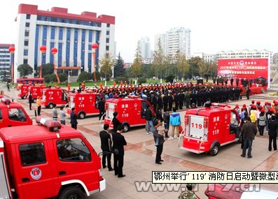 30余輛小型消防車(1噸消防車及2噸消防車)舉行交車儀式:構建覆蓋城鄉的火災防控網絡,由市政府牽頭,會同各區、開發區、街辦及公安、消防等部門共同出資300余萬元,為全市31個公安派出所分別配置一臺微型消防車,用以擔負防火巡查和初期火災撲救任務,以為119消防宣傳日做好準備。