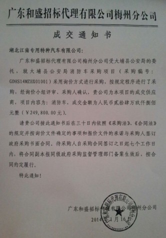 廣東和盛招標代理有限公司梅州分公司(以下簡稱“采購代理機構”)受大埔縣公安局(以下簡稱“采購人”)的委托,于2014年1月15日就大埔縣公安局消防車采購項目(采購編號:GDHS14MZHX01001)采用詢價方式進行采購。現就本次采購的成交結果公告如下: 一、采購人名稱:大埔縣公安局 二、采購項目名稱:大埔縣公安局消防車采購項目 三、項目編號:GDHS14MZHX01001 四、采購方式:詢價 五、采購項目簡要說明:(包括內容、簡要技術要求、合同履行日期等) 1、采購內容:消防車。 2、簡要技術要求、合同履行日期:詳見詢價文件用戶需求。 六、采購公告日期及媒體:采購代理機構于2014年1月7日在公開的媒體梅州市政府采購網網站上發布了采購公告。