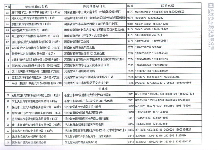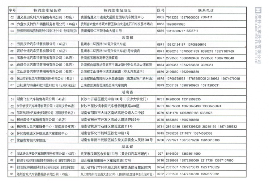 全國五十鈴(慶鈴)售后服務站通訊錄: