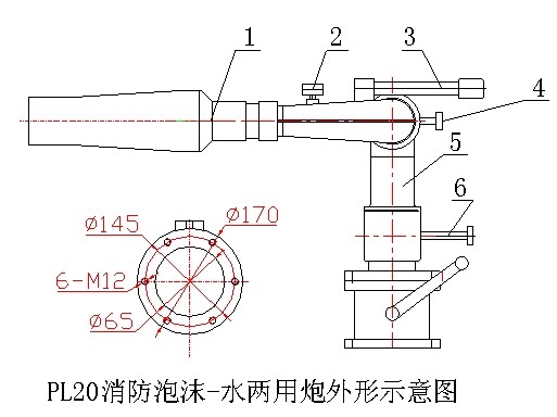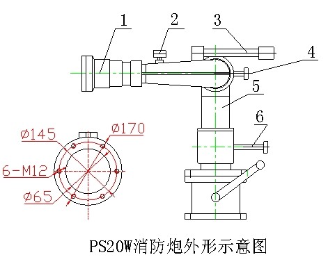 本產品主要結構外形如下圖所示,由炮頭(1)、壓力表(2)、消防炮手把(3)、上下鎖緊手輪(4)、炮體(5)、水平鎖緊手輪(6)等零部件組成。用戶可自行在連接座上安裝蝶閥(或球閥)來控制水流;松開水平上下鎖緊手輪,操縱手把(3)可實現炮的水平方向旋轉和炮口的上下旋轉,并由水平鎖緊手輪在任一位置鎖緊;水炮的開花直流炮頭,可實現炮口水柱射流和開花散射(水霧)。