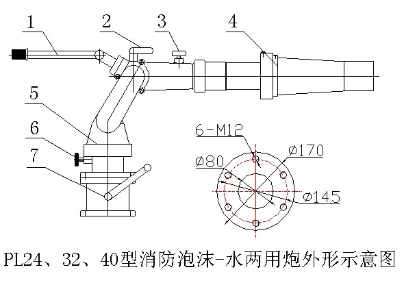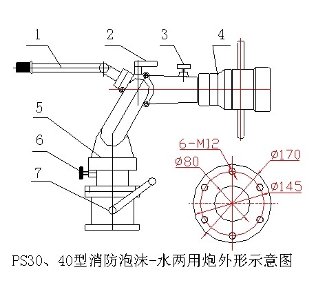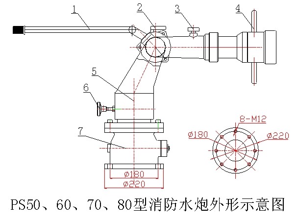 本產品主要結構外形如圖所示,由手柄(1)、鎖緊手柄(2)、壓力表(3)、炮頭(4)、炮體(5)、水平鎖緊手柄(6)、球閥(7)等零部件組成。松開水平鎖緊手柄(6),控制手柄(1)可實現水平方向旋轉,并由水平鎖緊手并在任一位置鎖緊;同時松開上下鎖緊(2)轉動手柄(1)可實現仰俯轉動-35°~+70°;水炮的開花直流炮頭,可實現炮口水柱射流和開花散射(水霧)。