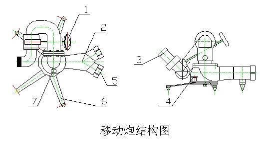 A、主要結構:移動式消防炮主要結構見下圖,主要由俯仰控制機構總成(1)、炮座總成(2)、炮頭總成(噴霧噴水兩用、噴水噴炮沫兩用炮頭)(3)、支架鎖緊裝置(4)、進水接扣2-65(5)、支架總成(6)、水平鎖緊(7)等零部件組成。水平回轉控制機構和俯仰控制機構自鎖能力好,可實現任一位置鎖定。