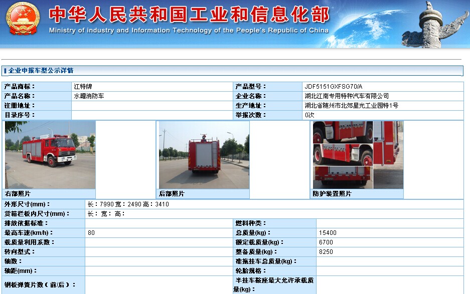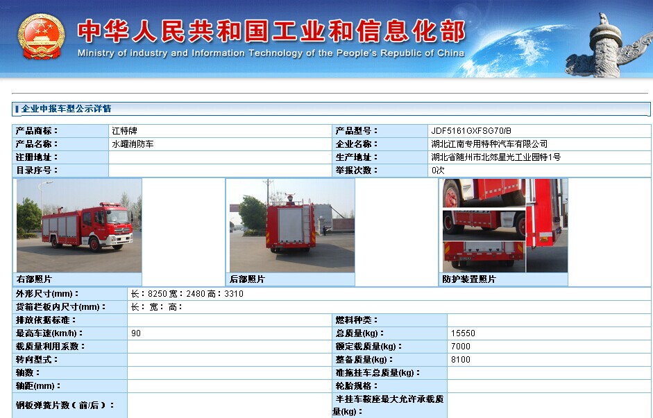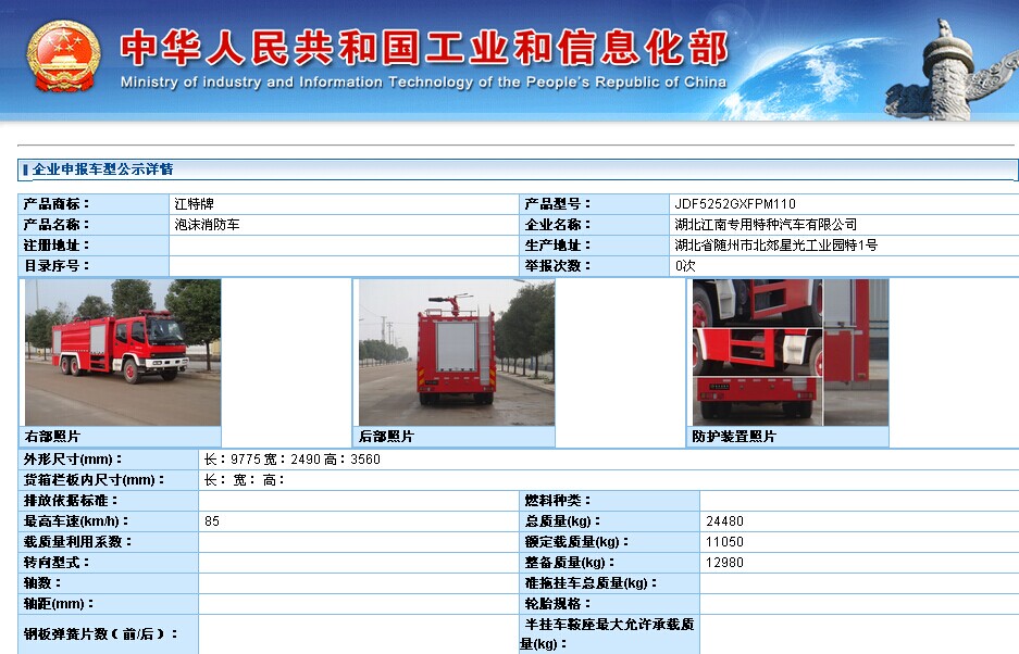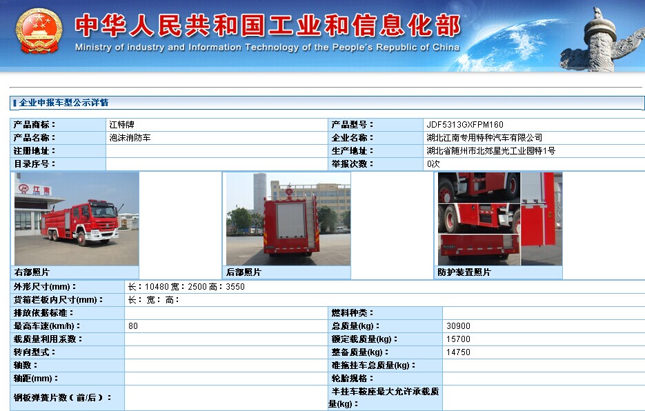 熱烈慶祝湖北江南專用特種汽車有限公司268批次國四消防車公告公示中。