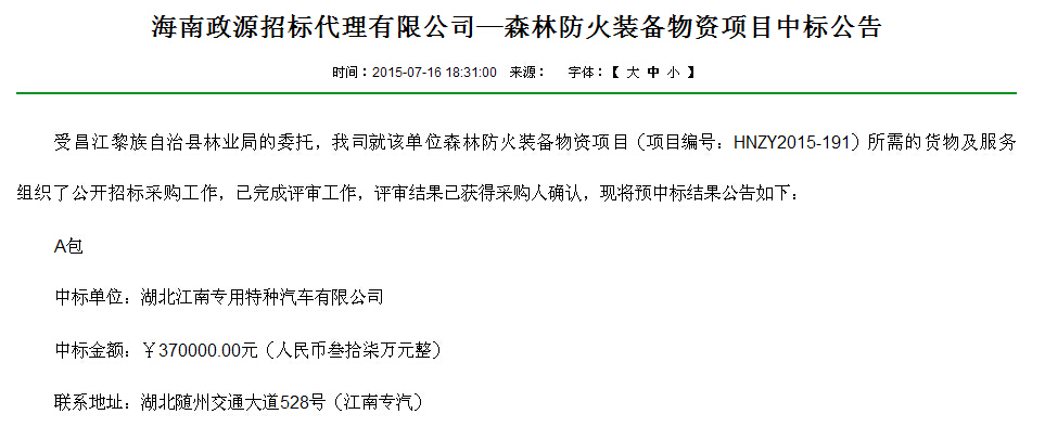 消防車中標(biāo)網(wǎng)址:http://mof.hainan.gov.cn/czt/zwxx/zfcg/cjgg/201507/t20150716_1615765.html