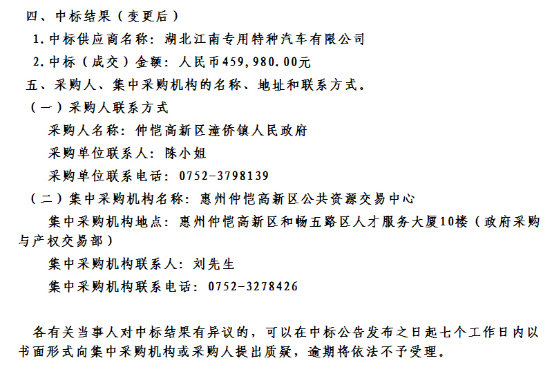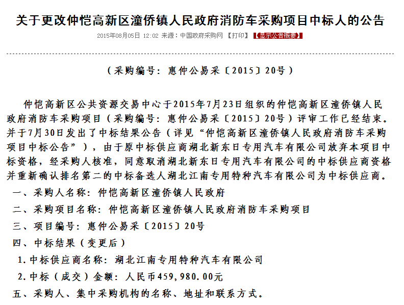 仲愷高新區潼僑鎮人民政府消防車采購項目更改中標截圖: