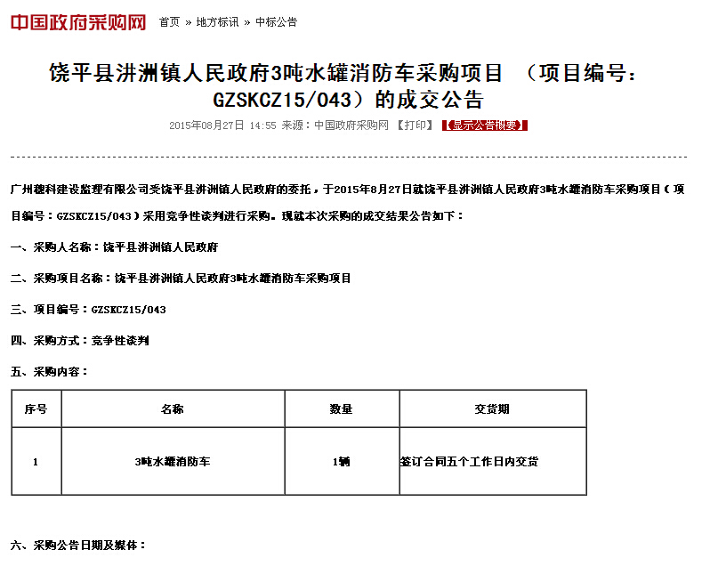 下面請看饒平縣汫洲鎮人民政府3噸水罐消防車采購項目 (項目編號:GZSKCZ15/043)中標公告:http://www.ccgp.gov.cn/cggg/dfgg/zbgg/201508/t20150827_5774957.htm
