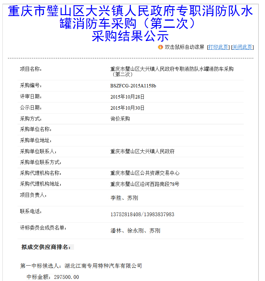 熱烈慶祝重慶市璧山區大興鎮人民政府專職消防隊水罐消防車采購我廠中標,政府中標網址鏈接:http://www.cqgp.gov.cn/portal/documentView.do?method=view&id=1118912