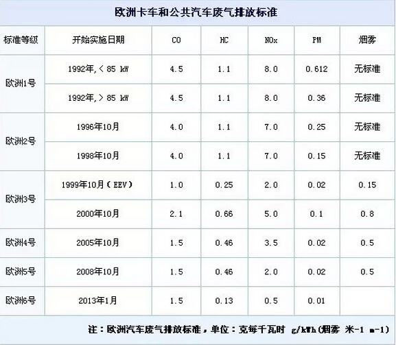 如上表所示,歐洲排放標(biāo)準(zhǔn)由歐盟參與國自愿認(rèn)可并在其國內(nèi)強(qiáng)制實(shí)施,自1992年至今,22年間更新了5個(gè)版本,差不多4年左右更新一次。同時(shí),歐洲排放標(biāo)準(zhǔn)將汽車分為總質(zhì)量不超過3500公斤(輕型車)和總質(zhì)量超過3500公斤(重型車)兩類。輕型車不管是汽油機(jī)或柴油機(jī)車,整車均在底盤測功機(jī)上進(jìn)行試驗(yàn);重型機(jī)則用所裝發(fā)動機(jī)在發(fā)動機(jī)臺架上進(jìn)行試驗(yàn),并以廢氣內(nèi)的CO(一氧化碳)、HC+NOX(碳?xì)浠衔锖偷趸?及PM(微粒,碳煙)等有害氣體為檢測依據(jù)(因?yàn)檫@些都能在人體中引起慢性中毒)。