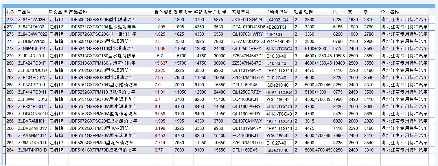 江特牌消防車國四公告目錄一覽表: