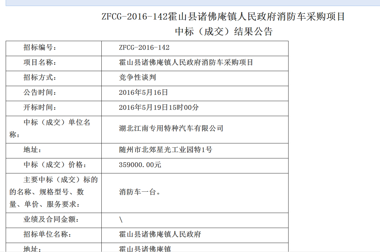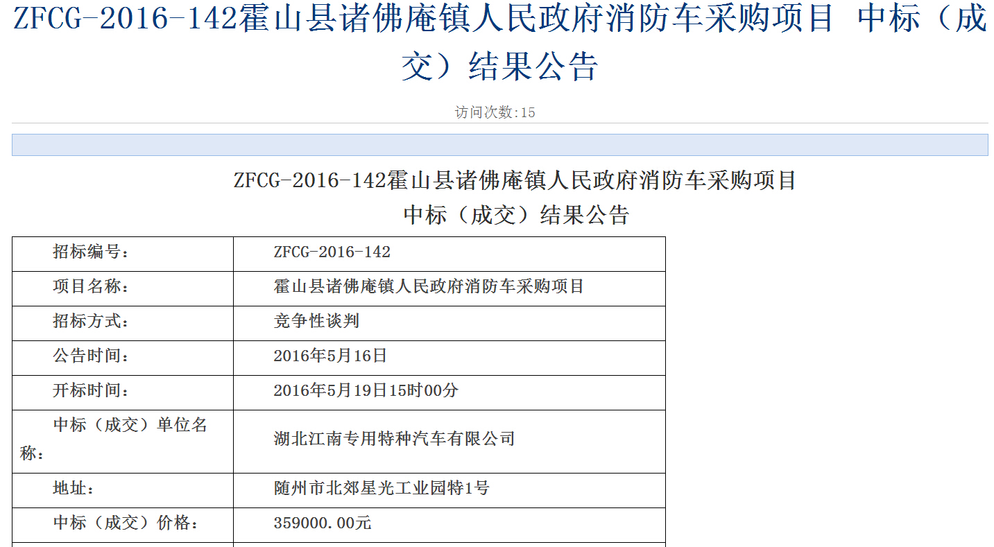 最新喜訊,我公司再次中標(biāo)東風(fēng)153水罐消防車,本次由霍山縣諸佛庵鎮(zhèn)人民政府消防車采購(gòu),投標(biāo)現(xiàn)場(chǎng)一共有4家供應(yīng)商前去應(yīng)標(biāo),經(jīng)過(guò)2番報(bào)價(jià),最終我廠以最低價(jià)中標(biāo),本次中標(biāo)結(jié)果已經(jīng)在各大政府采購(gòu)網(wǎng)公布,可以查詢結(jié)果,公布結(jié)果鏈接網(wǎng)址:http://www.ahzfcg.gov.cn/news/2016-05/b131ca4a-bf8b-43b2-a2da-778ca6b81715.html