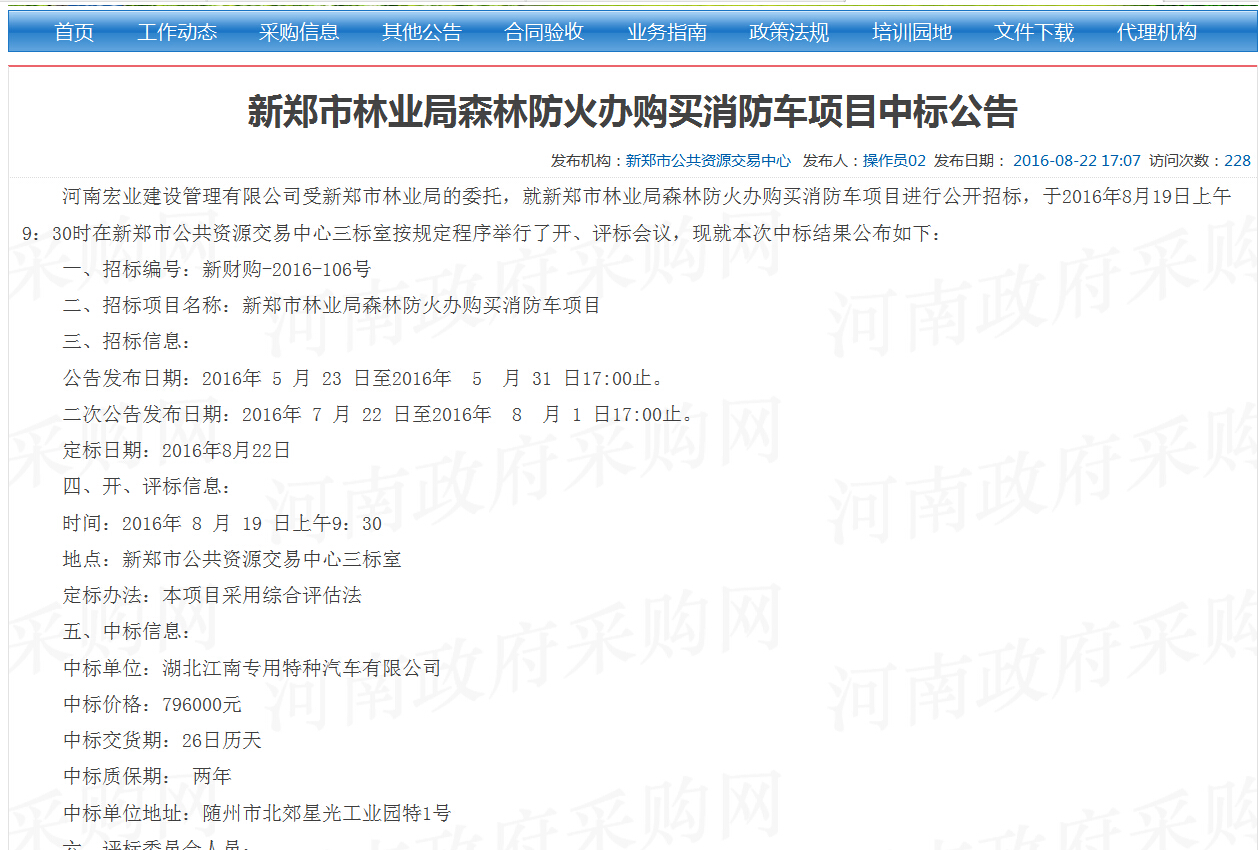 熱烈慶祝我公司中標2臺東風天錦水罐消防車,該車是由新鄭市林業局森林防火辦組織采購的森林消防車,經過2次的招標,最終由我公司成功中標,該車載水量6噸,采用CB10/60消防泵,射程可打60米。