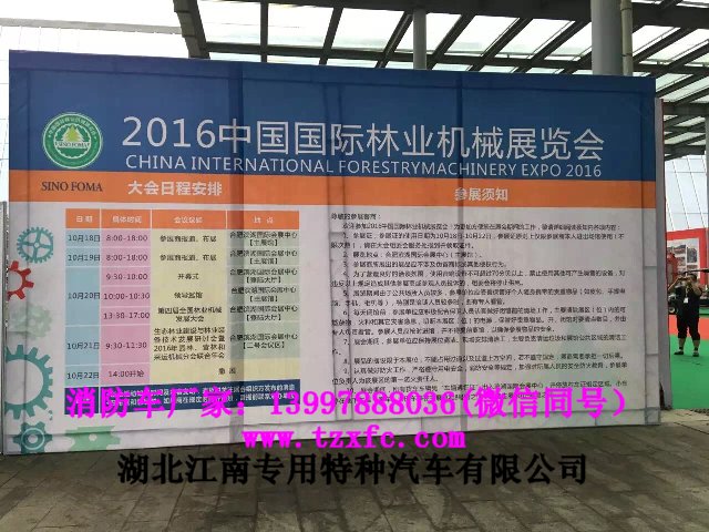 我公司接到2016中國國際林機展邀請在合肥濱湖國際會展中心的通知,于今日即10月20日在合肥濱湖國際會展中心參展,參展時間是2016年10月20-22日,我公司展位號是H4,歡迎經銷商及客戶來展參觀,我公司展會業務經理李鑫為您講解消防車性能及功能。參展業務經理李經理電話13997888037