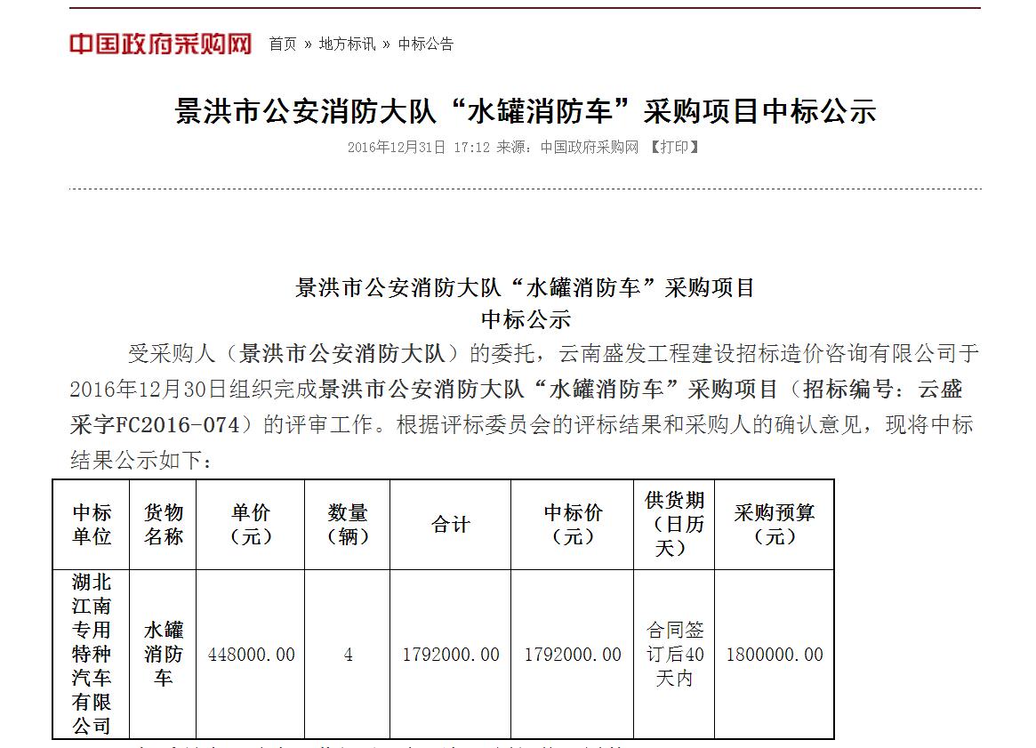 加景洪市公安消防大隊“水罐消防車”采購項目中標網站公示鏈接:http://www.ccgp.gov.cn/cggg/dfgg/zbgg/201612/t20161231_7819267.htm