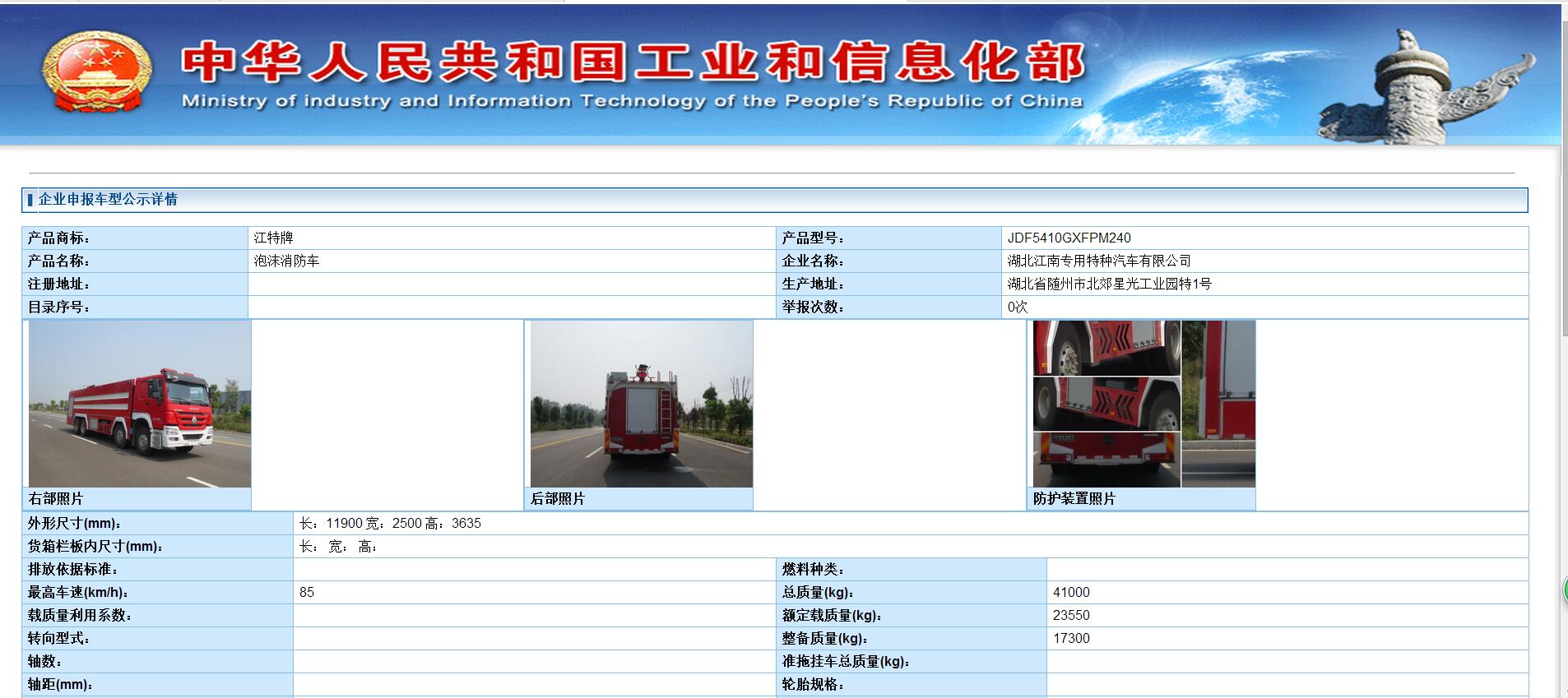 JDF5410GXFPM240 型泡沫消防車工信部公告截圖: