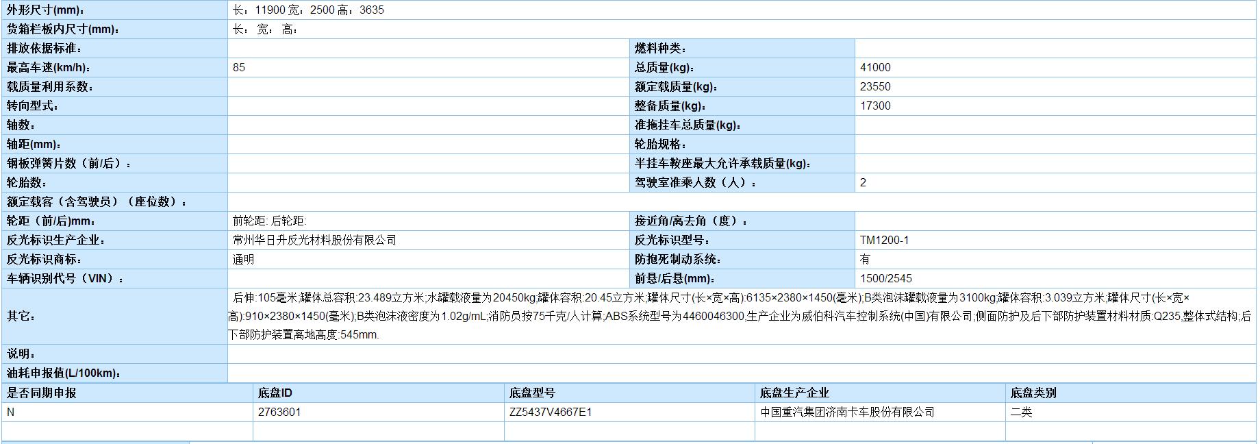 國五東風天錦泡沫消防車公示中,該車水容積4噸,泡沫容積2噸,底盤采用東風天錦原廠底盤,其底盤型號為DFL1160BX1V,整車型號為:JDF5154GXFPM60型泡沫消防車國五東風天錦泡沫消防車詳細技術參數請與我公司銷售部聯系,0722-3808778董經理