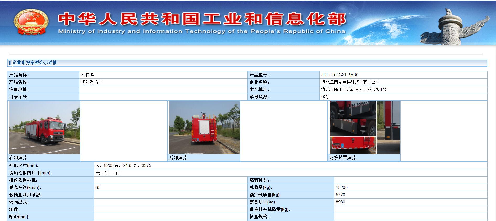 JDF5154GXFPM60型泡沫消防車工信部公告截圖: