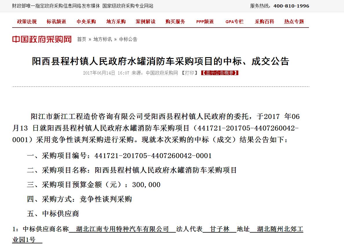 熱烈慶祝我公司就陽西縣程村鎮人民政府水罐消防車采購項目(項目編號441721-201705-4407260042-0001)采用競爭性談判采購項目順利中標,最終成交價294800元整。