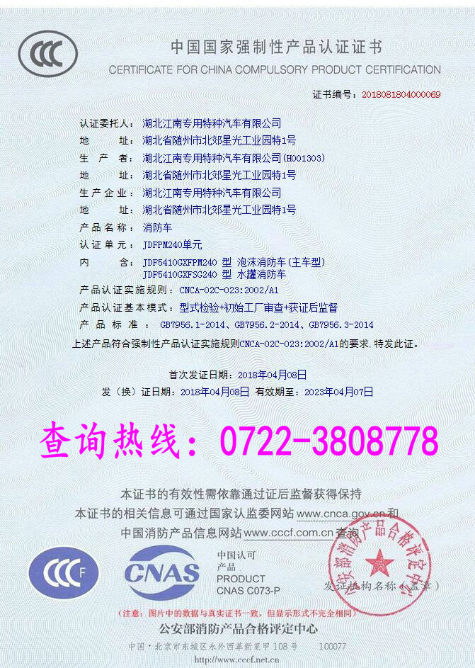 更多消防車產品CCC認證查詢熱線:13997888036(微信同號)