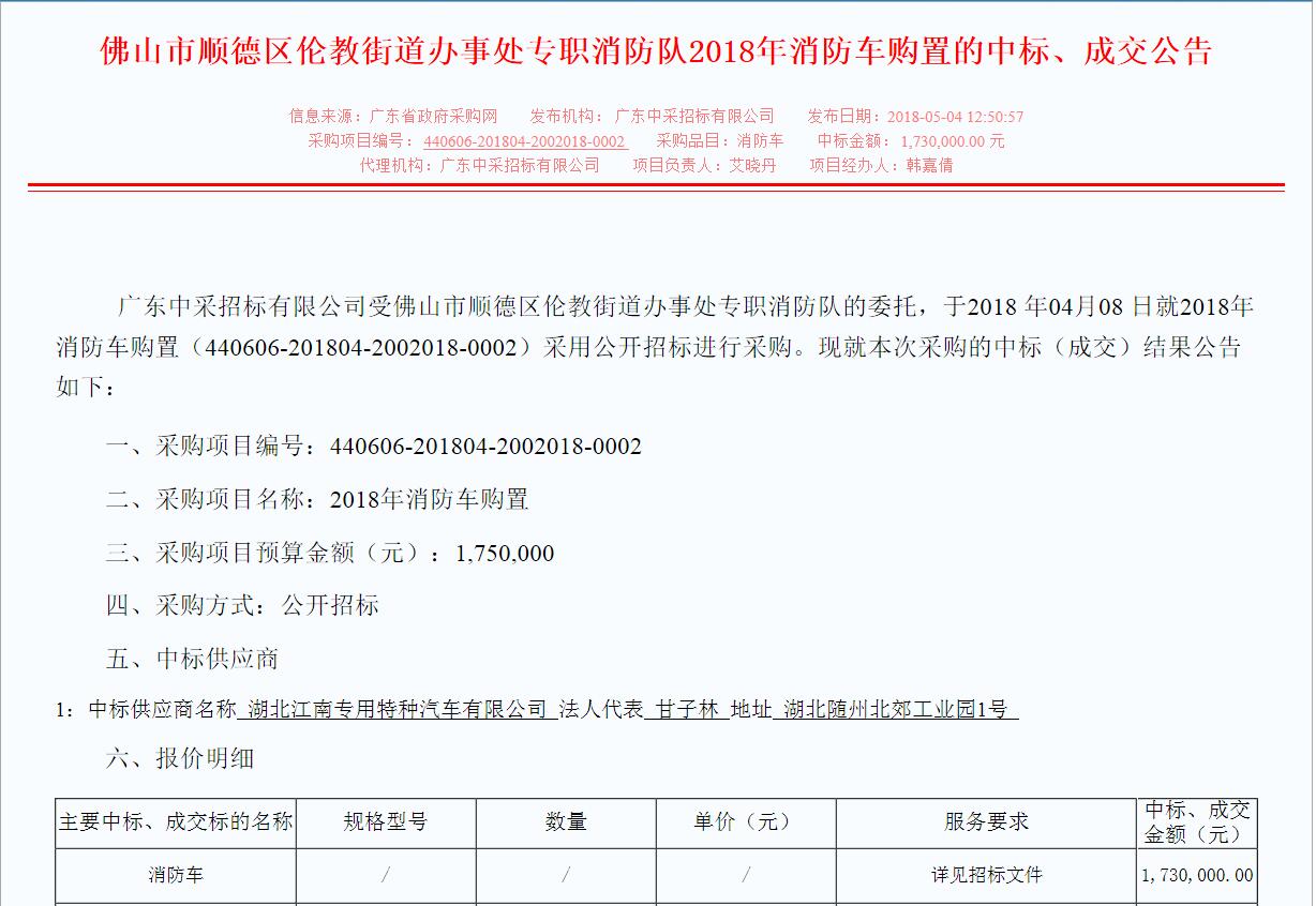 我公司參與廣東中采招標有限公司受佛山市順德區倫教街道辦事處專職消防隊采購項目,于2018 年04月08 日就2018年消防車購置(440606-201804-2002018-0002)采用公開招標進行采購。已成功中標,其中標的改款車型為JDF5204GXFPM80型泡沫消防車,其中標金額173萬元整,該車的詳細技術配置請致電廠家銷售13997888036董經理