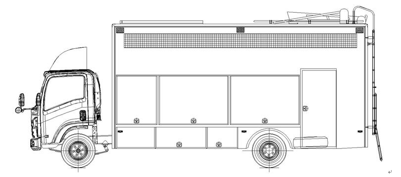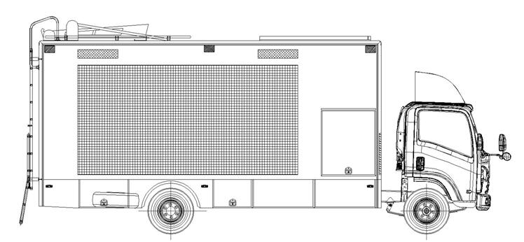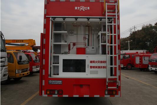 3.3、基本結構:車體側后方安裝一個廂體門,車體頂部安裝一個廂體門,配合煙霧逃生JH通道使用;車體尾部設置爬梯,供消防員上下車頂;車體前部設有抽拉式8千瓦發(fā)電機組。側面安裝P6 LED全彩屏3840mm*1920mm;車廂內安裝控制系統(tǒng):臺式電腦,音柱: 2只60W/只 功放:360W;車廂內部安裝煙霧逃生通道演練系統(tǒng),爬梯,上部安裝樓層結繩逃生體驗功能;另側面安裝模擬報警訓練系統(tǒng)、消防安全標識認知系統(tǒng)、電氣火災成因試驗系統(tǒng)、建筑消防設施模擬系統(tǒng)、火災隱患查找系統(tǒng)。