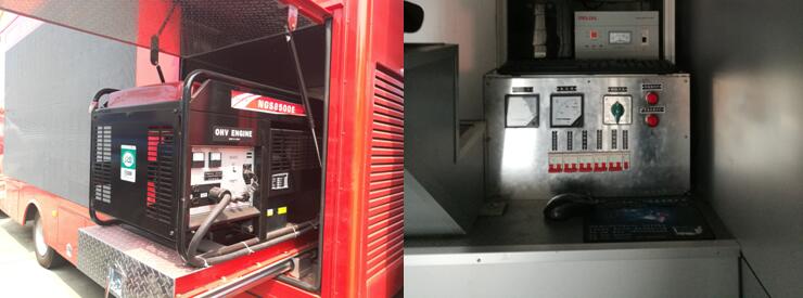 隨車安裝一臺10KVA靜音發(fā)電機組,確保整車用電,發(fā)電機組采用抽拉式可移出廂體外結構,方便散熱及維護。配有外接電源接口和220V移動線盤,方便市電使用。配備電源集中控制箱,使整車電器設備操作更安全,更方便,更人性化。