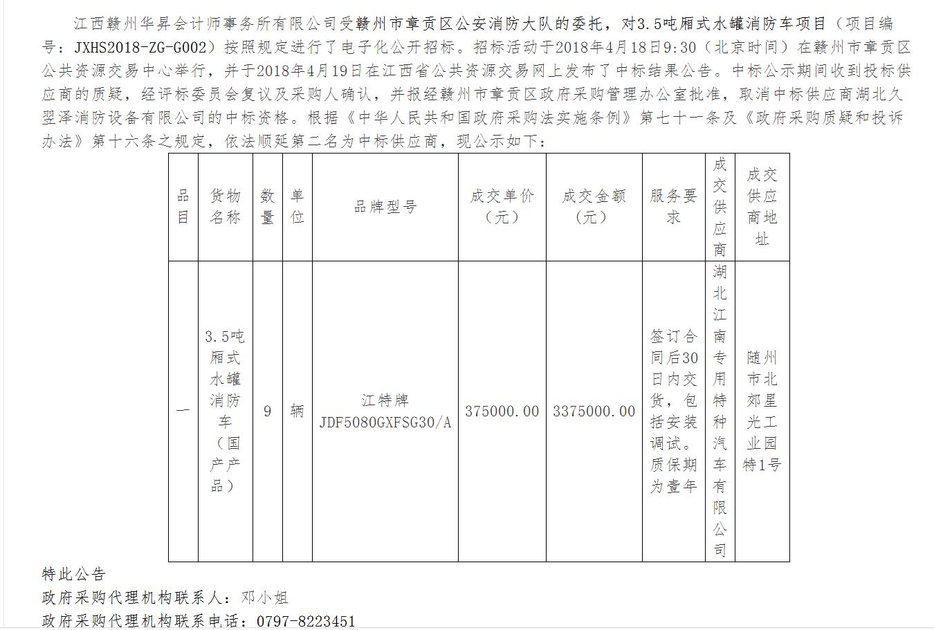 東風(fēng)多利卡水罐消防車中標(biāo)鏈接網(wǎng)址及截圖:http://www.jxsggzy.cn/web/jyxx/002006/002006004/20180504/9f7e1bd5-53c7-4364-86a1-86e4f3b28ed7.html