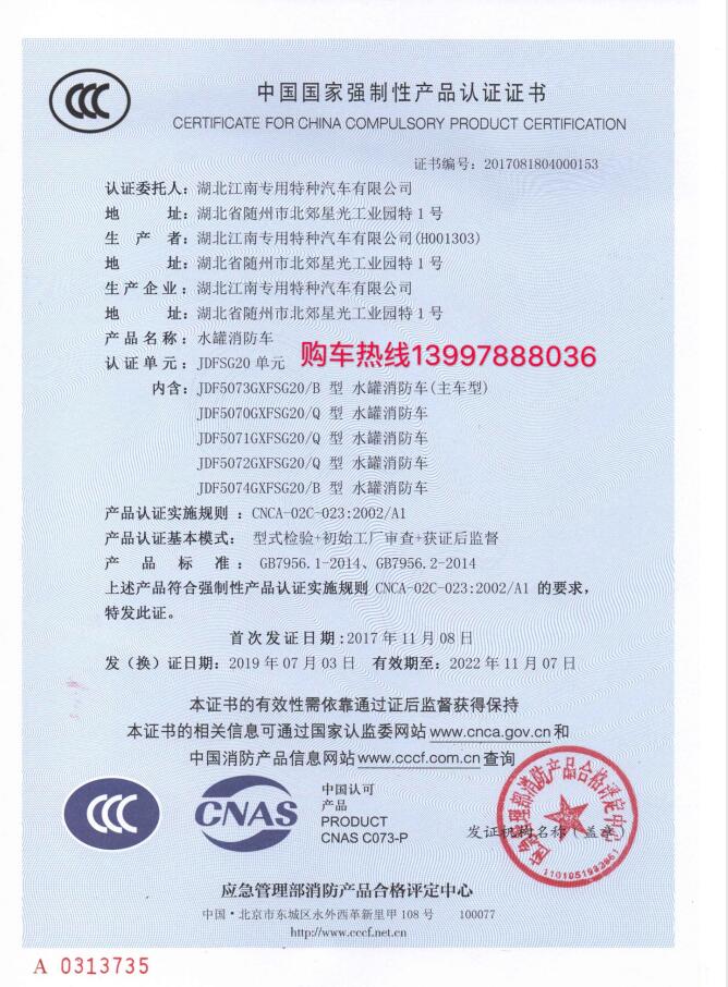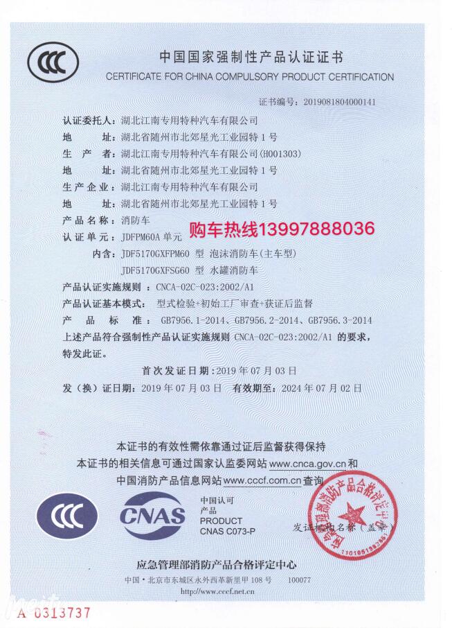 更多消防車CCC認證查詢請咨詢廠家銷售0722-3808778,13997888036董經理