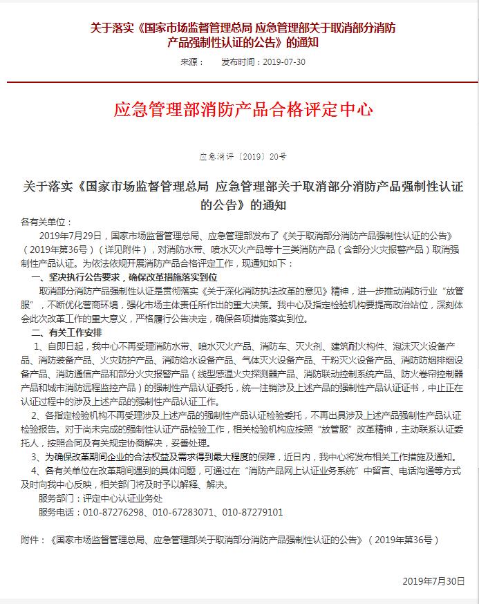 應(yīng)急管理部關(guān)于取消部分消防產(chǎn)品強制性認證的公告