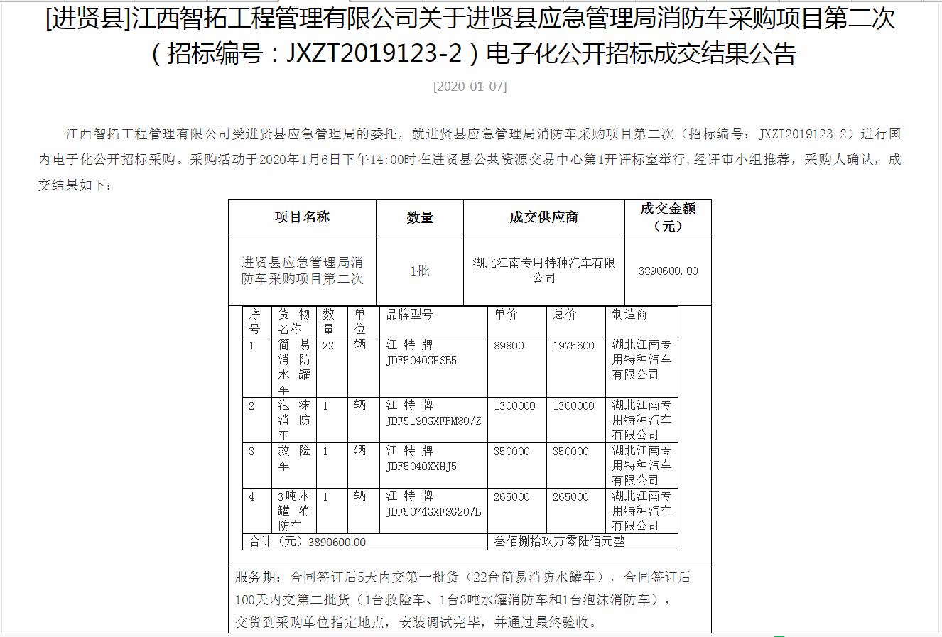 熱烈慶祝我公司成功中標25輛消防車,本次項目由江西智拓工程管理有限公司受進賢縣應急管理局的委托,就進賢縣應急管理局消防車采購項目第二次(招標編號:JXZT2019123-2)進行國內電子化公開招標采購。其中標的車型為22輛福田簡易型消防車,1輛8噸泡沫消防車,1輛救險車,1輛水罐消防車