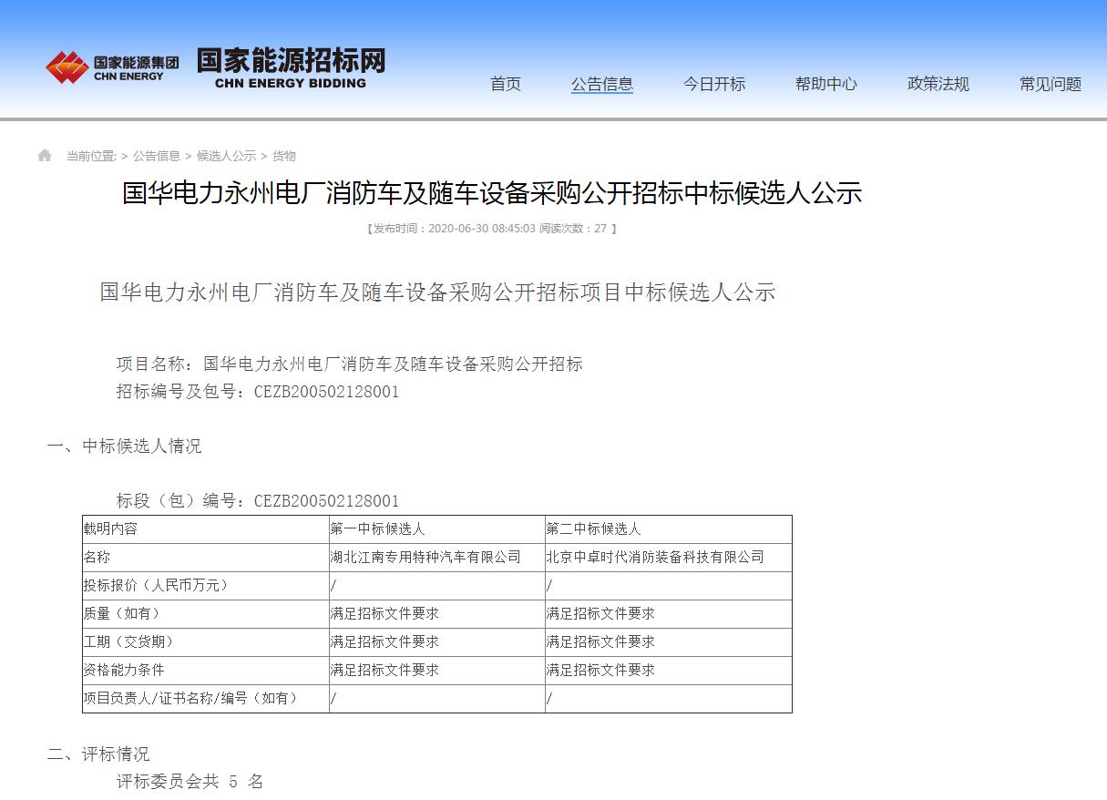 國華電力永州電廠消防車及隨車設備采購我公司成功中標13997888036