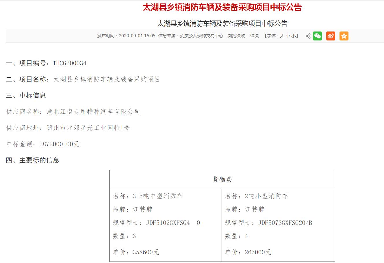太湖縣鄉(xiāng)鎮(zhèn)消防車輛及裝備采購項目我公司成功中標,其中標總金額為2872000元整,3臺中型消防車,罐體容積為4噸,4臺小型消防車,罐體容積為2.5噸。2款車型的詳細技術(shù)規(guī)格請致電13997888036董經(jīng)理