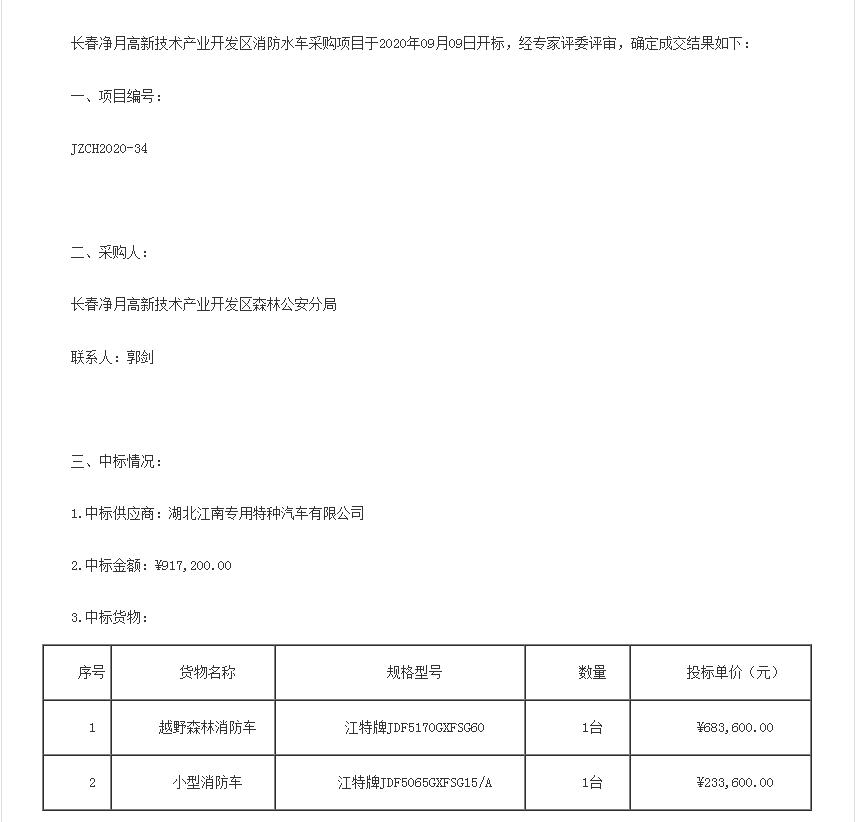 長春凈月高新技術產業開發區森林公安分局委托長春凈月高新技術產業開發區政府采購中心根據《中華人民共和國政府采購法》、《政府采購貨物和服務招標投標管理辦法》等有關法律法規的規定,對長春凈月高新技術產業開發區消防水車采購項目進行公開招標, 經專家評委評審,確定湖北江南專用特種汽車有限公司中標。廠家電話:13997888036董經理 http://procure.jingyue.gov.cn/cms/information/showinformation.html?id=3703