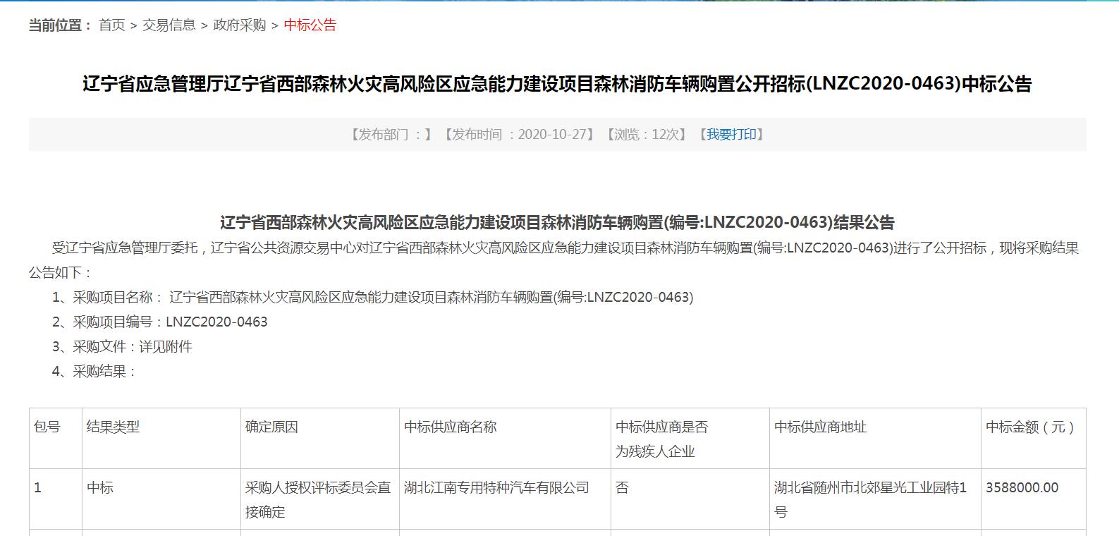 熱烈慶祝我公司成功中標一批16噸森林消防車,該項目受遼寧省應急管理廳委托,遼寧省公共資源交易中心對遼寧省西部森林火災高風險區應急能力建設項目森林消防車輛購置(編號:LNZC2020-0463)進行了公開招標,現將采購結果公告如下:
